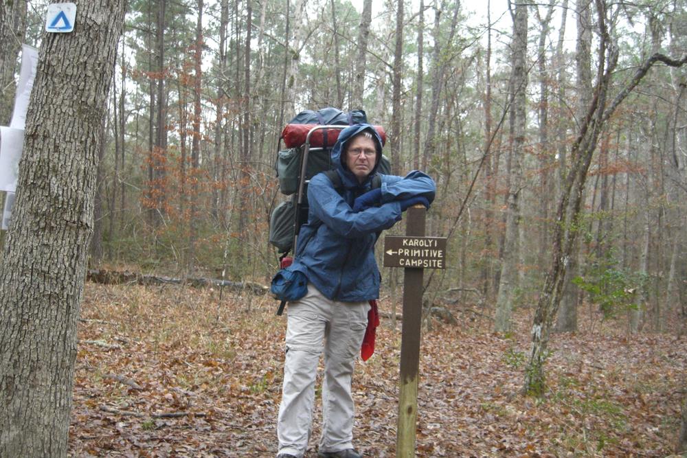 This particular collection was extracted from the Four Notch Primitive Camp and reflects a selection of logbook entries from February 2015 through May 2021. Approximately 76 thru-hikers provided an entry and there were many section and day hikers offering comments as well. The first entry in the logbook was from February 21, 2015. The Four Notch Primitive Campsite was completed on that day by students and trail volunteers. Purely by chance, I used the campsite on February 23, 2015 on my first thru-hike of the LSHT, when the campsite was only two days old. It was a rainy, cold, and miserable day, and I cut the day short to rest and get out of the weather. A couple hikers from San Antonio joined me in the campsite. It was cold, and frost accumulated on our shelters overnight. I didn’t leave a logbook entry that day, but I was grateful for the small amenities provided. I learned on that hike that it was time to ditch old gear and make the transition to ultralight equipment. My gear was old, but I was older. Below is a photo of me calling it quits that day. I looked pretty grumpy.